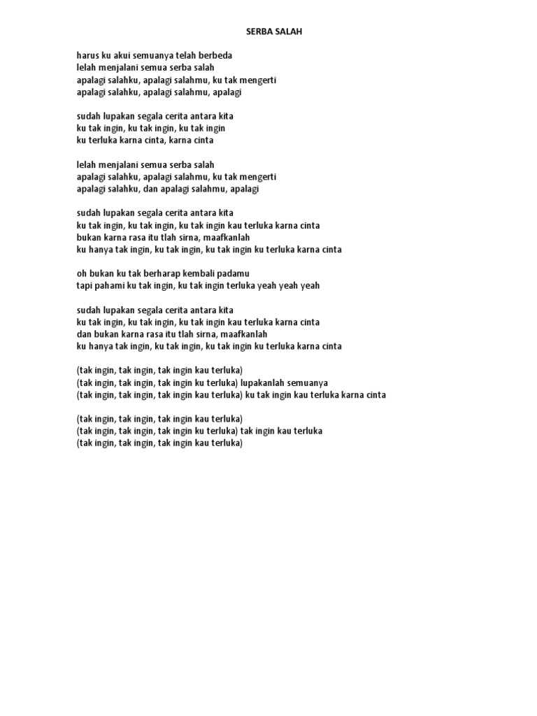 Pergilah kau Pergi dari hidupku Bawalah semua rasa bersalahmu Pergilah kau Pergi dari hidupku Bawalah rahasiamu yang tak ingin. Lirik Lagu Eren - Terluka Lyrics ku sangkakan madu ternyata racun ku sangka bahagia ternyata sengsara manis mulutmu bicara aku tergoda pahit ku dapat sampai ku tak menyangka kesetiaanmu hanya sesaat saja hanya membuat luka perasaanku setelah ku melihat kau bersamanya ku putuskan saja pergi jauh darimu aku kecewa aku terluka sakitnya hatiku. Lirik Lagu Eren - Terluka Lyrics ku sangkakan madu ternyata racun ku sangka bahagia ternyata sengsara manis mulutmu bicara aku tergoda pahit ku dapat sampai ku tak menyangka kesetiaanmu hanya sesaat saja hanya membuat luka perasaanku setelah ku melihat kau bersamanya ku putuskan saja pergi jauh darimu aku kecewa aku terluka sakitnya hatiku.